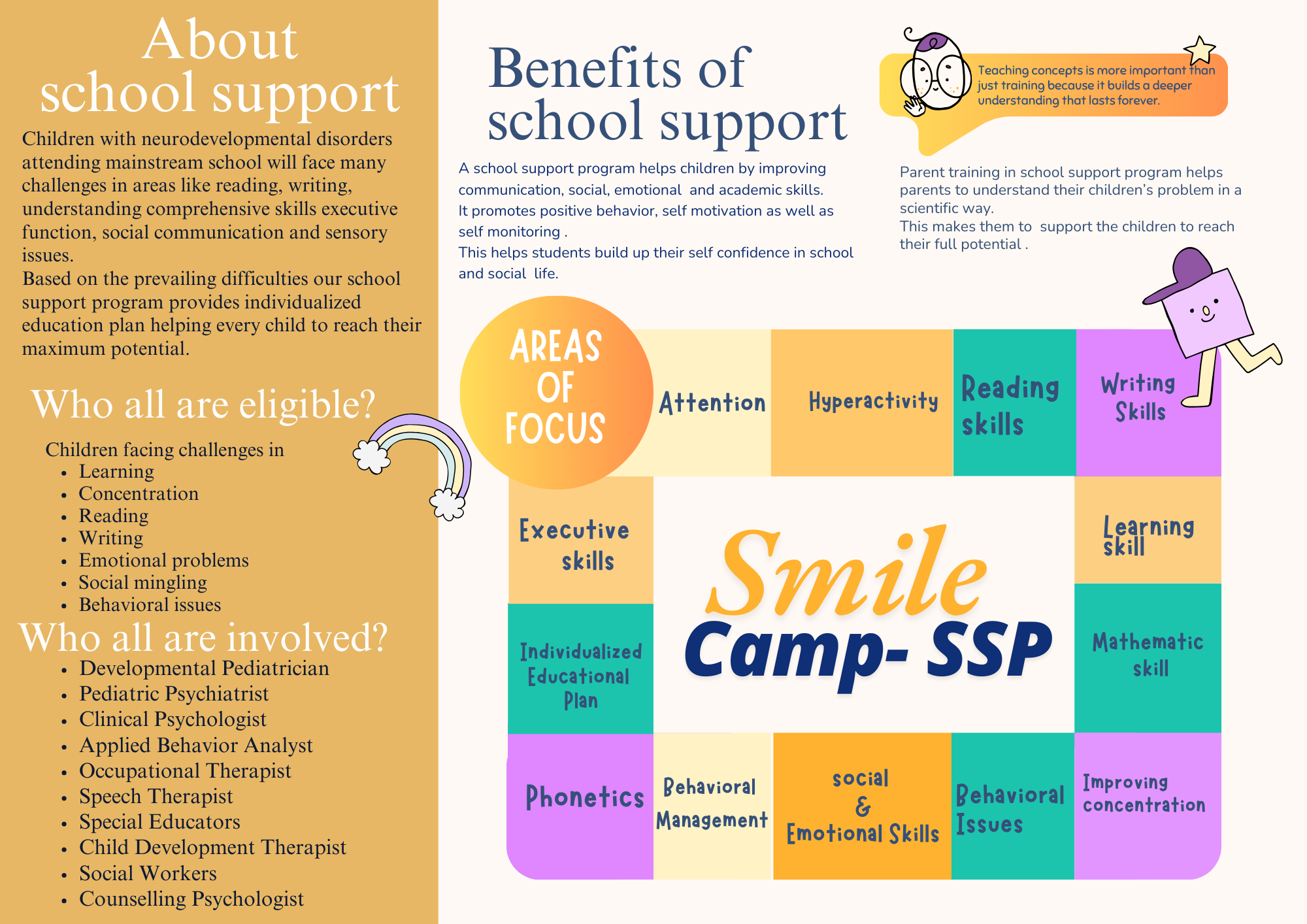 Comprehensive support for attention deficit and hyperactivity disorders through behavioral interventions and family training.
